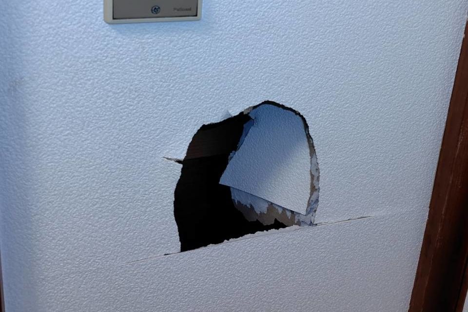スイッチパネルの斜め下の白い壁に大きな穴が開いている様子